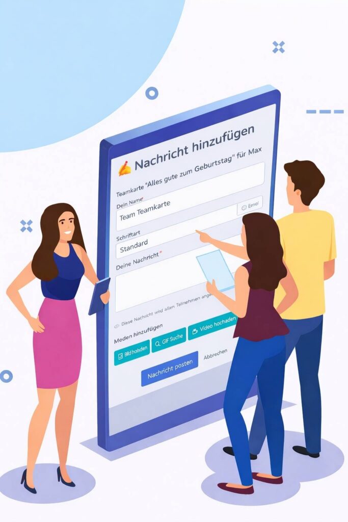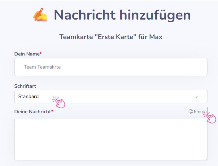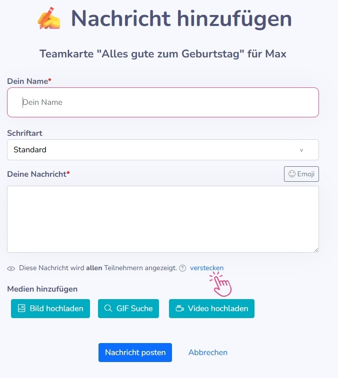 Um einen Eintrag zu erstellen, öffnest du den Link zur Teamkarte, den du vom Kartengründer erhalten hast, und verfasst deine Nachricht im Textfeld. Anschließend kannst du optional Bilder, Videos oder GIFs hochladen, um deine Grüße noch persönlicher zu gestalten, bevor du deinen Eintrag absendest.